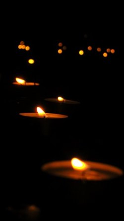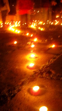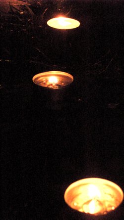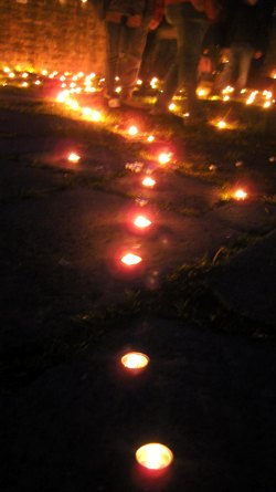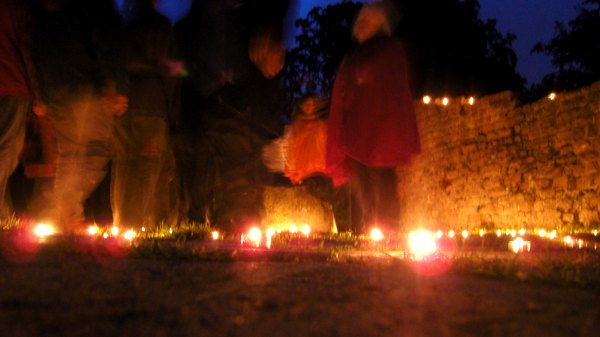 Wir stellen innerlich auf das Schreiten im Labyrinth ein. Das Begehen in einer bestimmten einfachen Schrittfolge findet zuerst in Stille statt. Dann stimmen wir beim Schreiten ein Lied an (z.B das Spiral-Lied von Arunga Heiden). Dann geht jeder wieder für sich in meditativer Weise die Bahnen des zwischen den Kerzen entlang. In der Mitte angekommen gibt es einen Moment des Innehaltens. Man lässt die Energie der vielen Lichter auf sich wirken und empfindet sich selbst in der Mitte der Kreise und von sich Selbst. Je nach dem spiele ich Didgeridoo, singe ein Mantra und wir stimmen etwas gemeinsam an. Das Herausgehen ist ebenso ein Schreiten. Zum Ende stehen wir außen um das Labyrinth- es gibt wieder klangliche Elemente zum Abschluss. Die Form des Labyrinthes war oft die des Fünfstern-Labyrinthes, welches auf Gabriela Shinkara, ihren Lebenpartner und die Fünfstern-Praxis zurückgeht. Beim letzten Mal (Juli 2010) haben wir eine Spirale ausgelegt. Lasse Dich durch die Fotos (s.u.) in die Stimmung des Lichterlabrinthes hineintragen!