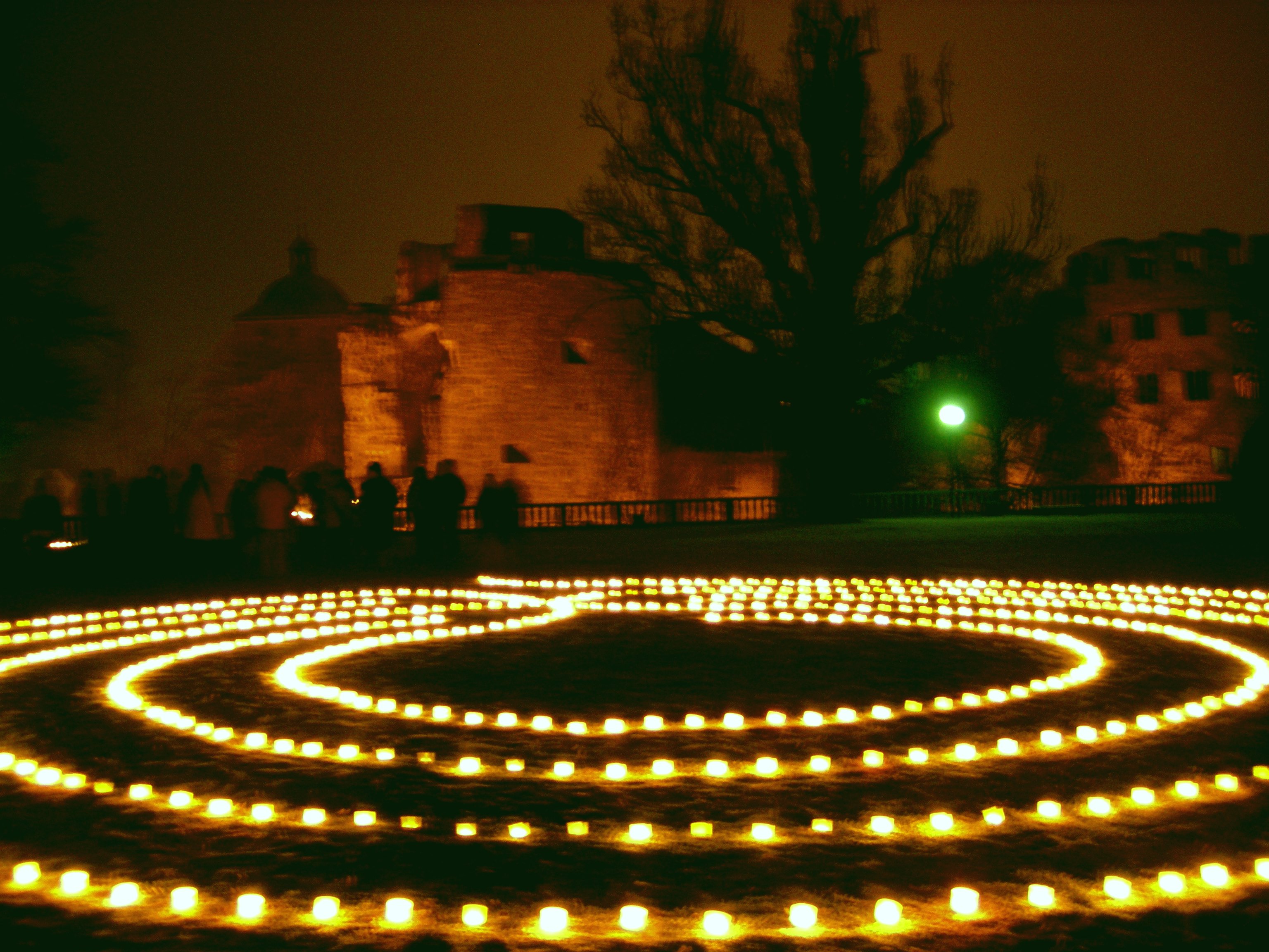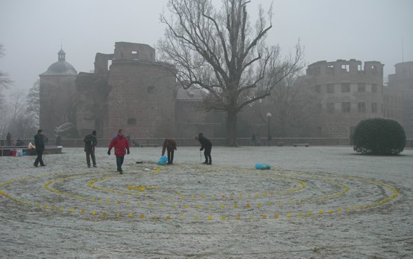Dies war mein erstes Labyrith in Heidelberg. Ich fand es wunderbar, dass wir die Genehmigung im Heidelberger Schlossgarten bekamen. Allerdings war es sehr kalt. Von den letzten kalten Nächten lag sehr viel Reif am Boden und auf den Bäumen, was für eine sehr mysthische Atmosphäre sorgte.